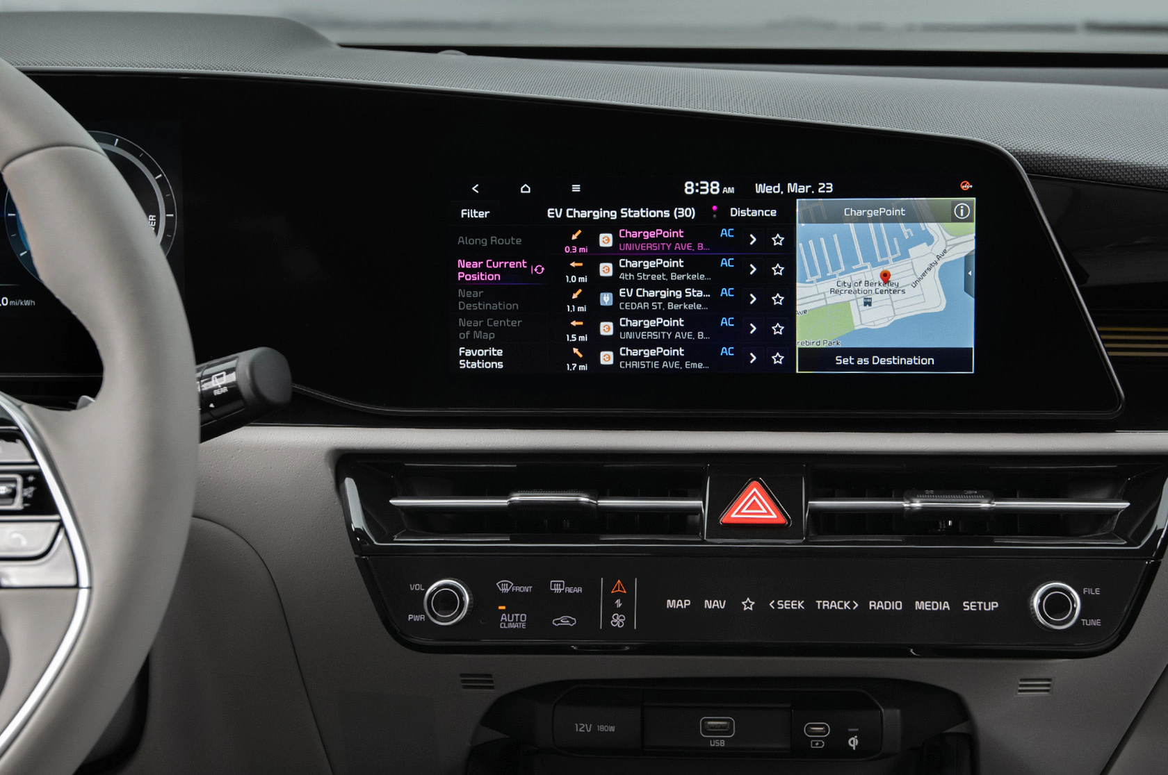 Không gian nội thất của xe điện Kia Niro 2023 đã được nâng cấp lên phong cách, thoát khỏi gốc gác của xe hạng bình dân. Mặc dù vẫn có thể tìm thấy nhựa cứng trong nội thất, nhưng thiết kế tổng thể và các hoàn thiện cung cấp trải nghiệm hiện đại và thẩm mỹ hơn. Không gian cabin được chiếm bởi hai màn hình 10,3 inch được lắp đặt dưới một tấm kính duy nhất, hiển thị đồ họa sắc nét và rõ ràng.